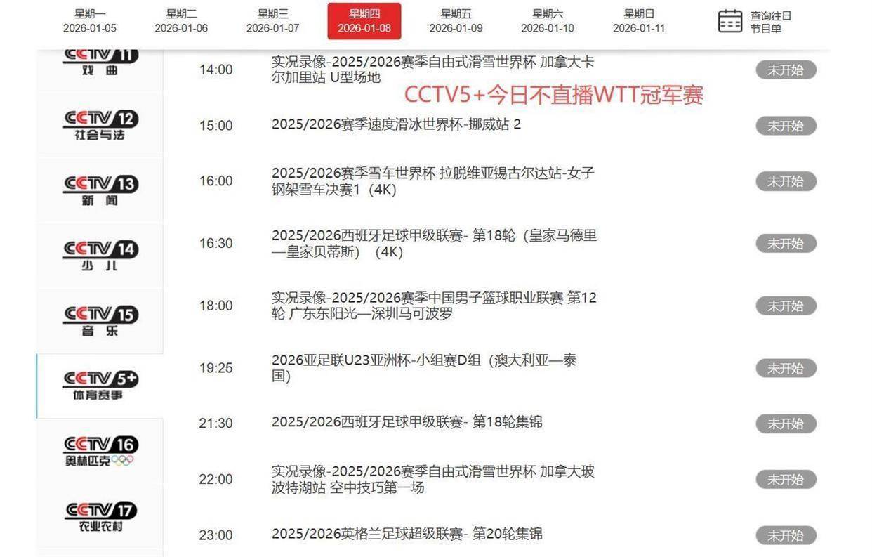 央视的直播安排出现了较大调整。 原本可能转播赛事的CCTV5+频道,1月8日不再转播WTT多哈冠军赛;CCTV5频道的直播时间则从原定的22点30分提前到了18点。 调整的原因是,CCTV5将从21点55分开始转播U23亚洲杯中国男足对阵伊拉克的焦点战。