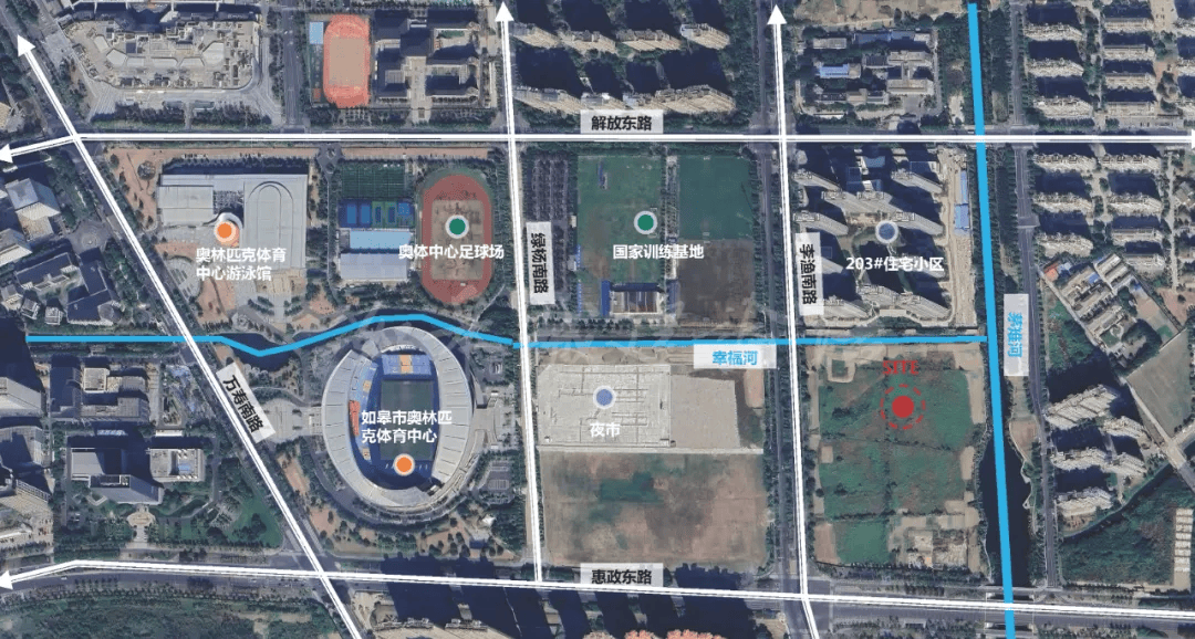 如皋市足球训练基地有着清晰的区位布局,基地西侧紧邻李渔南路,南侧为惠政东路,北侧是 203 号住宅小区,东侧依茅雉河而建,项目用地面积约 50425.5 平方米,在城市版图中勾勒出专业体育空间的崭新轮廓。