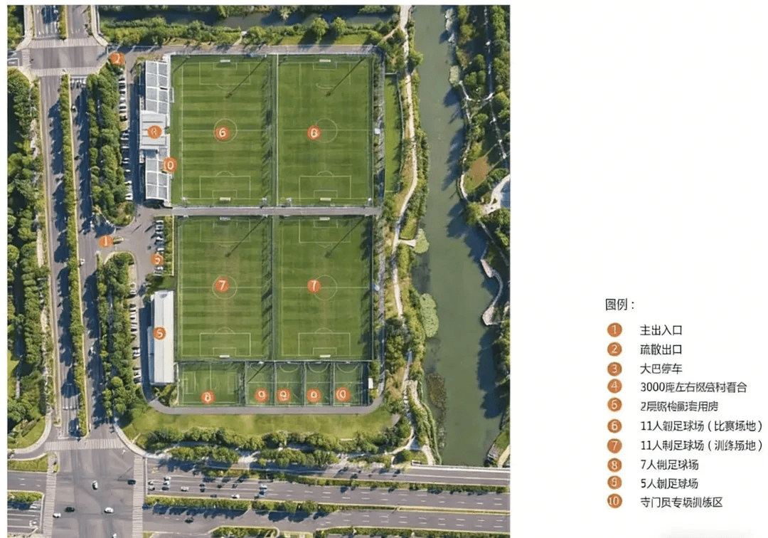 在场地运营的细节规划上,基地同样考虑周全。停车场实施分区设置,专门规划球队、媒体大巴车位,以及普通机动车停车位,车位数量至少满足 60 辆,保障赛事与训练期间的交通集散;同时明确主出入口、疏散出口的布局,梳理清晰的车行、人行、非机动车流线,实现人车分流、有序通行。