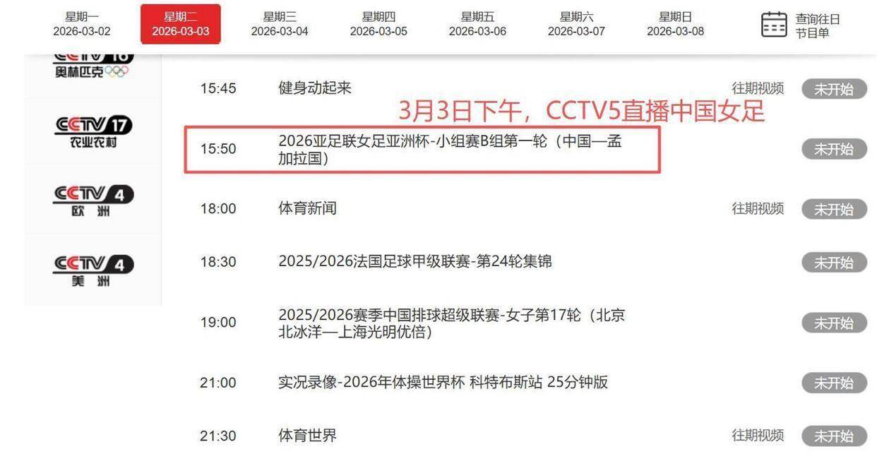 中央广播电视总台已经公布了本场比赛的直播安排。 CCTV5体育频道将在北京时间3月3日下午16点整,开始直播中国女足对阵孟加拉国女足的全场比赛。 对于无法收看电视直播的球迷,也可以通过央视频、央视体育客户端等网络平台同步观看。这场比赛的直播,预计将吸引大量关心中国女足的观众。返回搜狐,查看更多