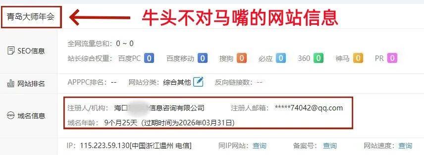 利箭小编查到“青岛大狮年会”的网站备案是“海口某某信息咨询有限公司”,这与青岛大狮就对不上号了,系假冒!