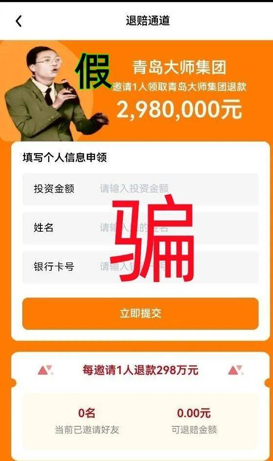 但是骗子为了让更多人入坑,骗取曾经相信“云数贸”、“智天金融”的人的个人信息与钞票,很牵强的把这两大传销项目也弄进去了,“青岛大狮”邀请一人退款298万元,“云数贸”邀请一人注册退款388万元,“智天集团”邀请一人来注册退款488万元???这明显就是假的,用一串串虚假无用的数字来“利诱”,非法收集参与者身份信息的。